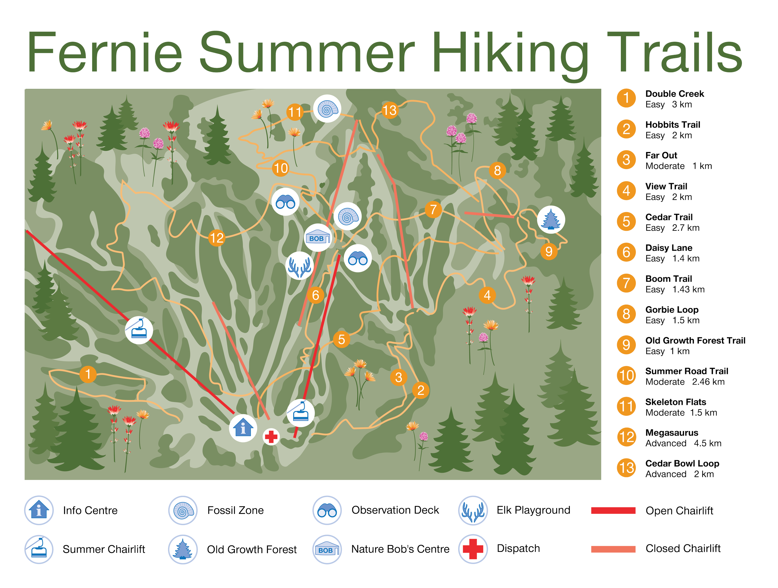 For this project, I designed a summer hiking trail map of Fernie Alpine Resort. My goal was to create a simple, friendly, and nature-inspired look, using minimal colors. I redrew the icons several times to keep them clean and consistent, using monochrome and uniform stroke weights. To capture the natural beauty of the mountains, I included illustrations of three wildflowers. The map was designed to be easy to read and family-friendly, encouraging people to explore Fernie’s stunning outdoors.