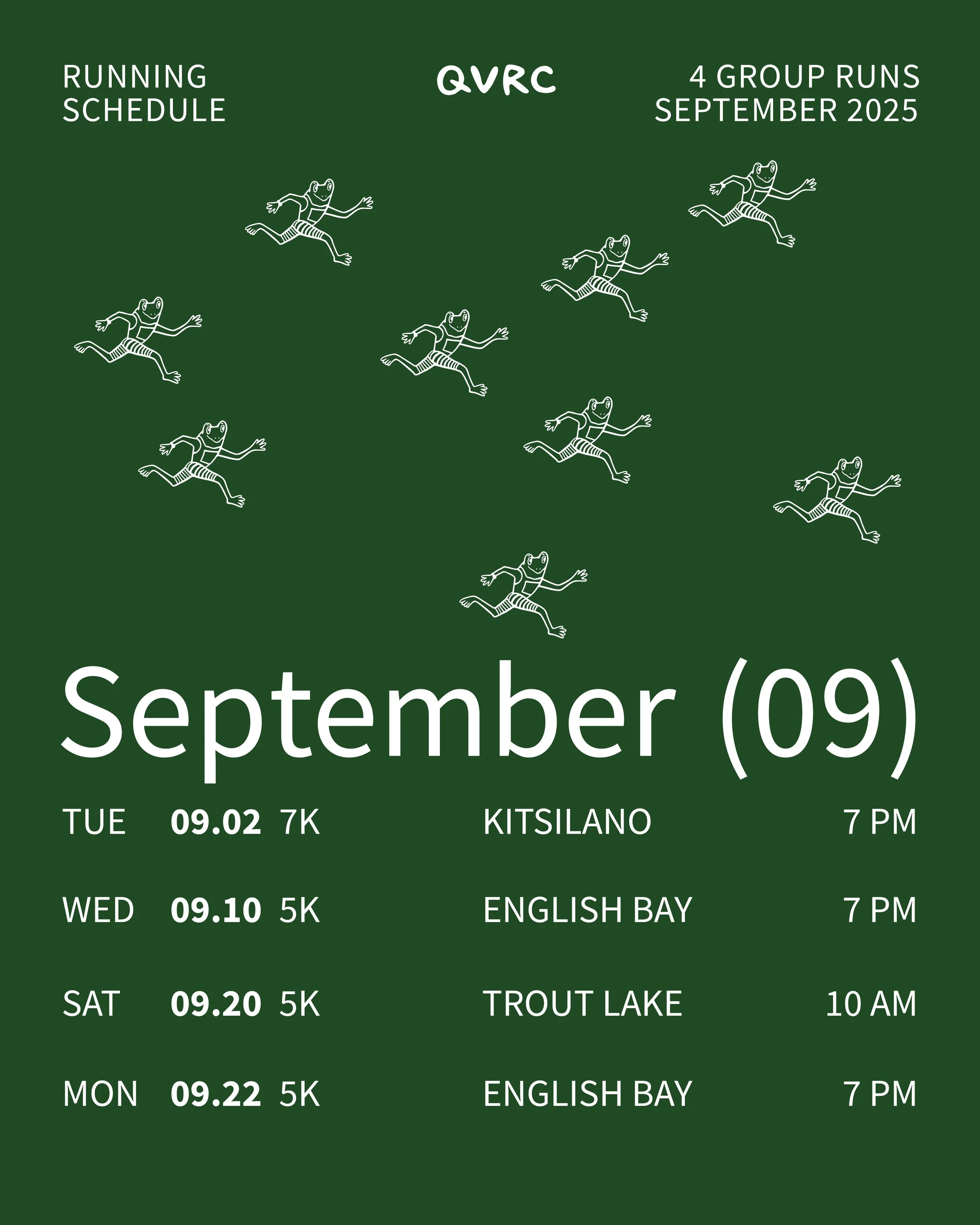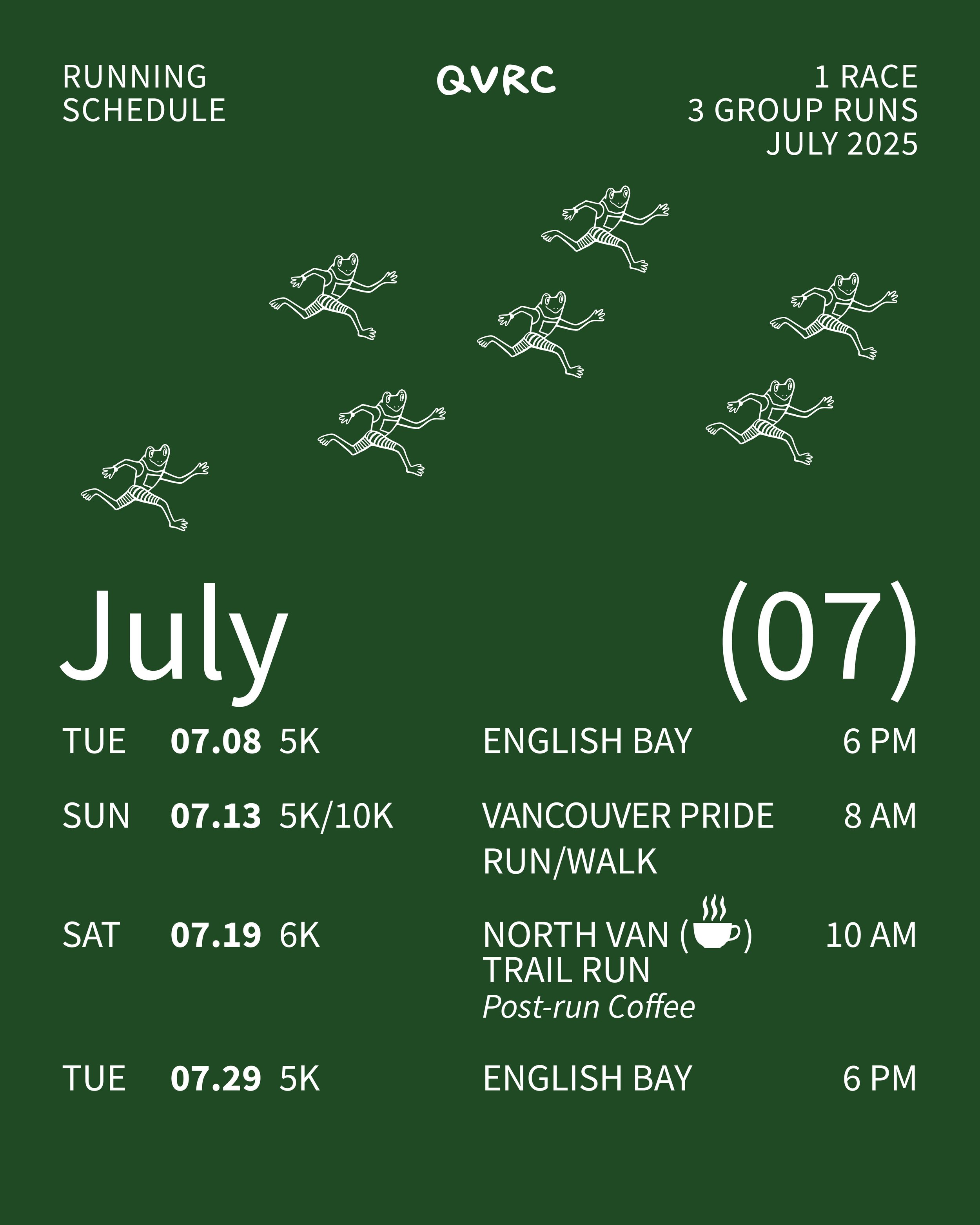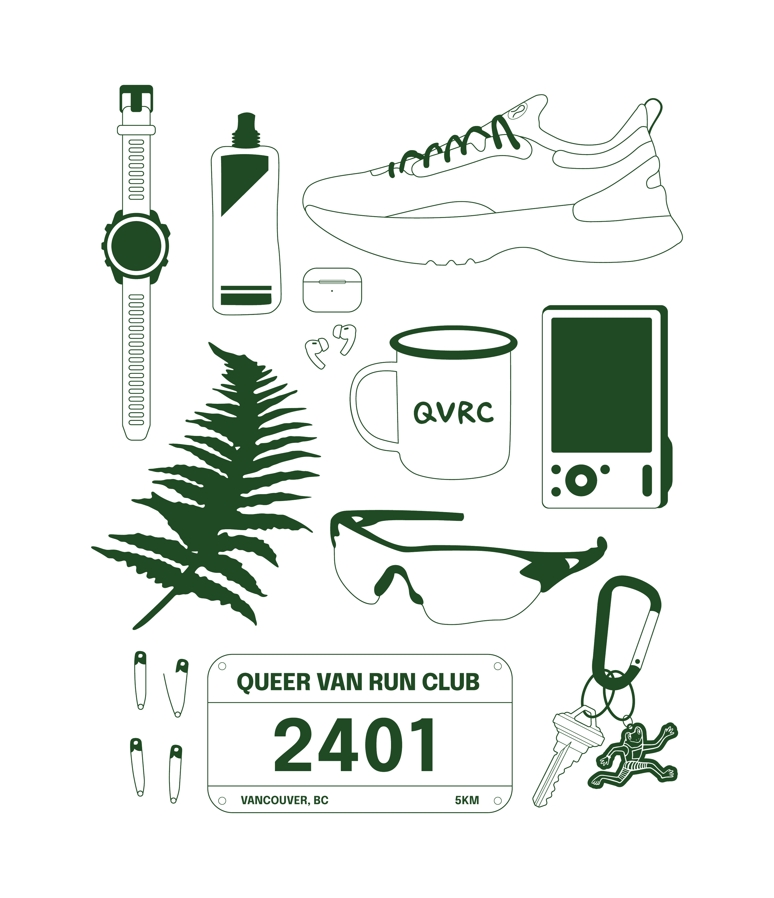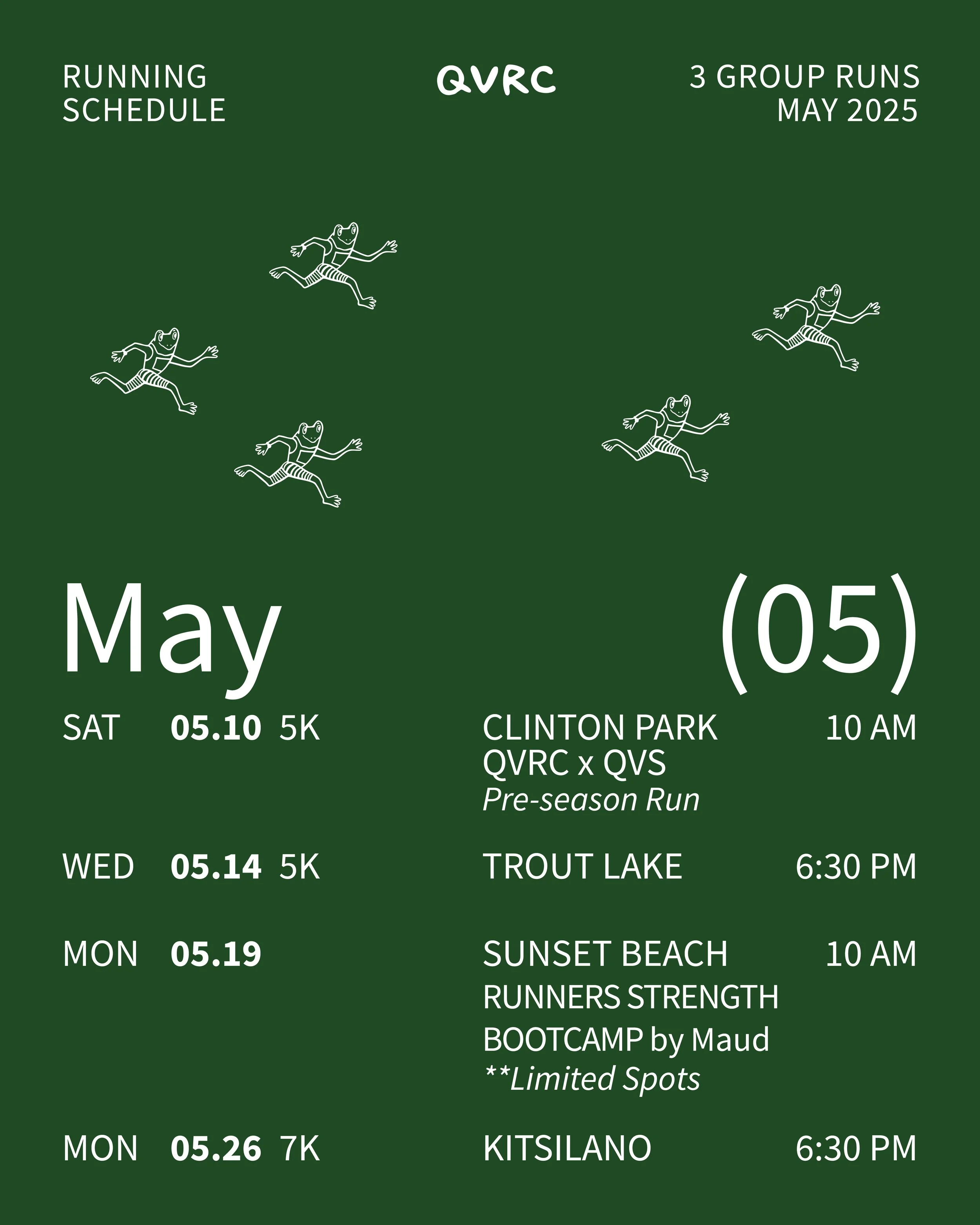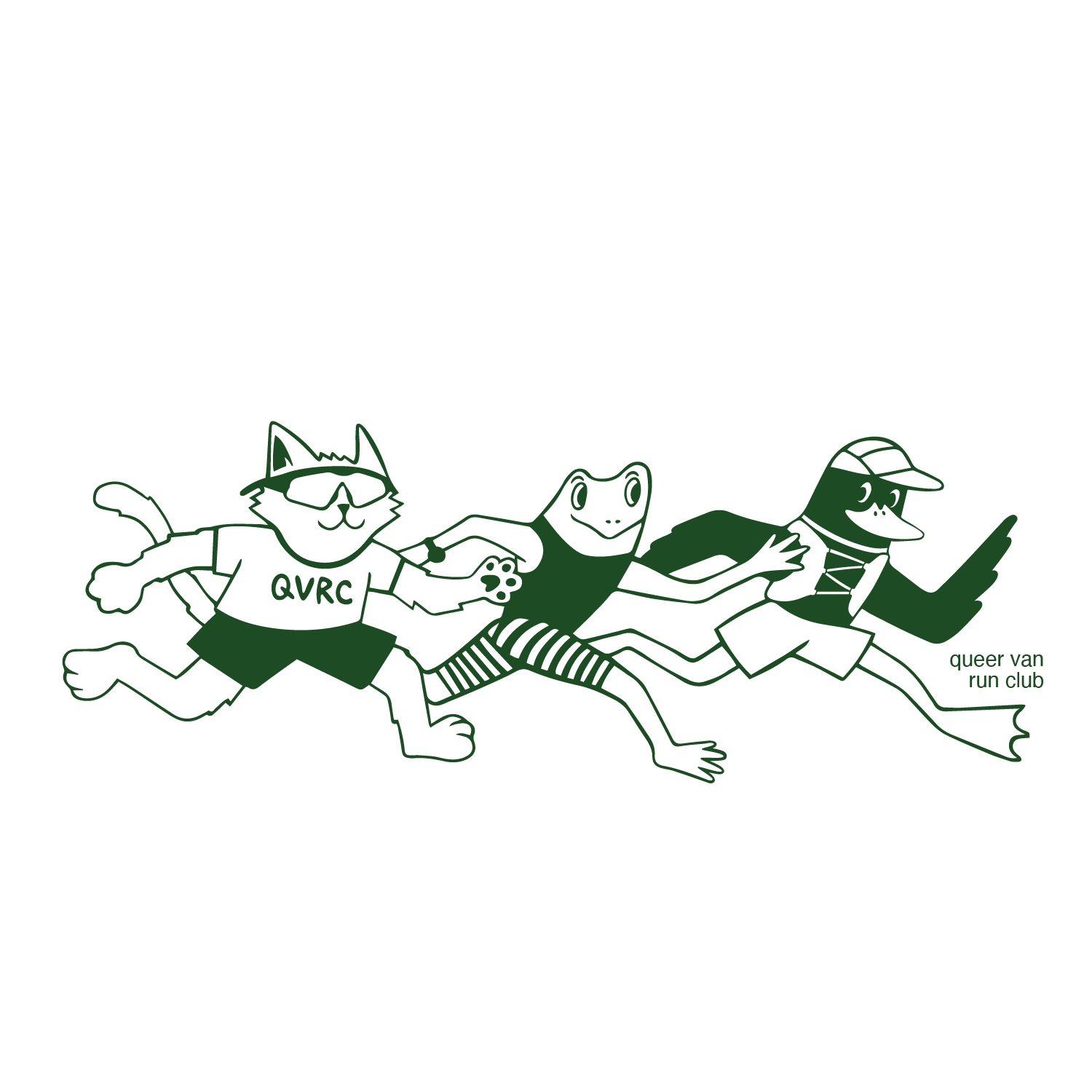 Queer Van Run Club is a registered nonprofit creating an inclusive running space for Vancouver’s queer community, offering two paces to keep the club accessible and welcoming. When I joined, the identity began with a hand-drawn frog sketch. I refined and vectorized the original illustration, developed logo variations, defined the typography, and built a cohesive visual system centered around a strong, single-color green palette.